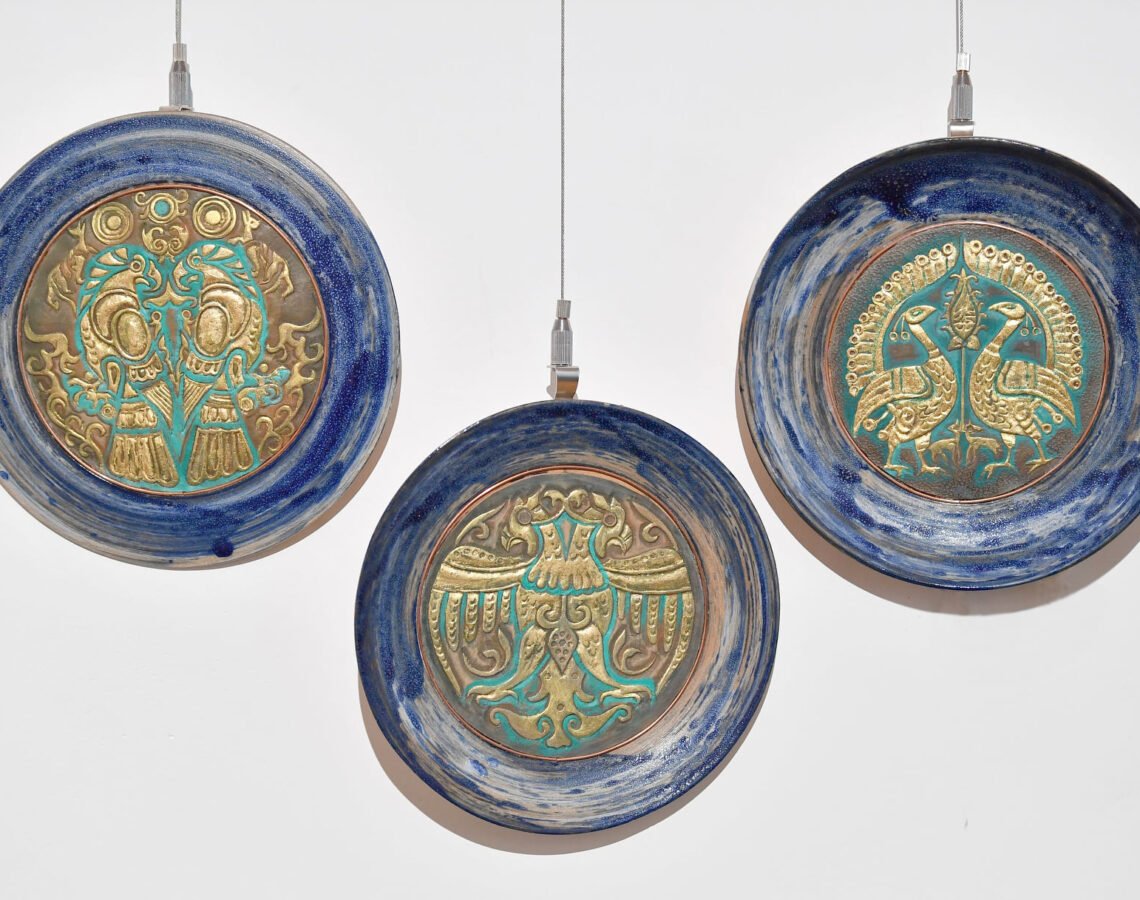 As an artist, I depicted the national pride birds—the falcon and the trotting partridge—from 13th-century silk patterns in my works. I carved these images into leather, embedded them into a ceramic (clay) plate, and framed them with copper lighting. I then transformed this imagery into a leather embossing and crafted a chest, presenting the whole as a single collection piece.”