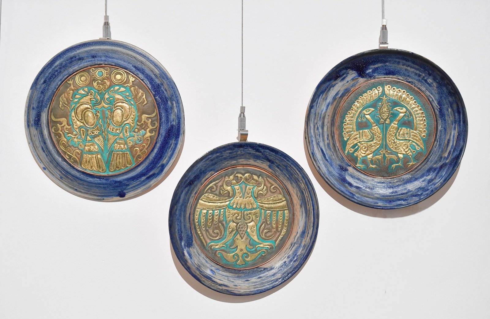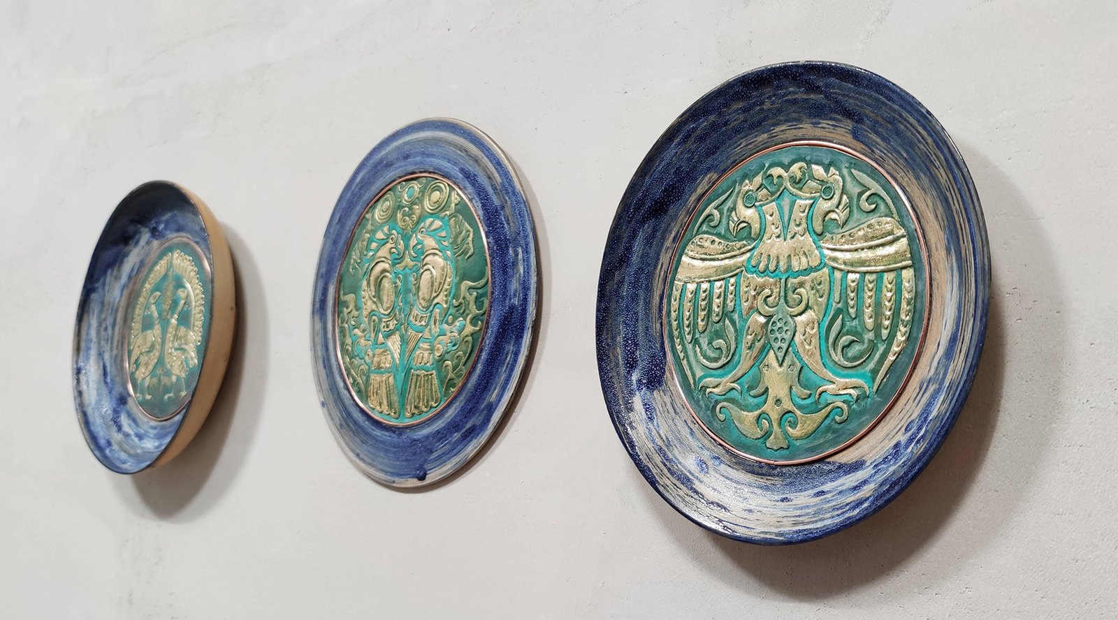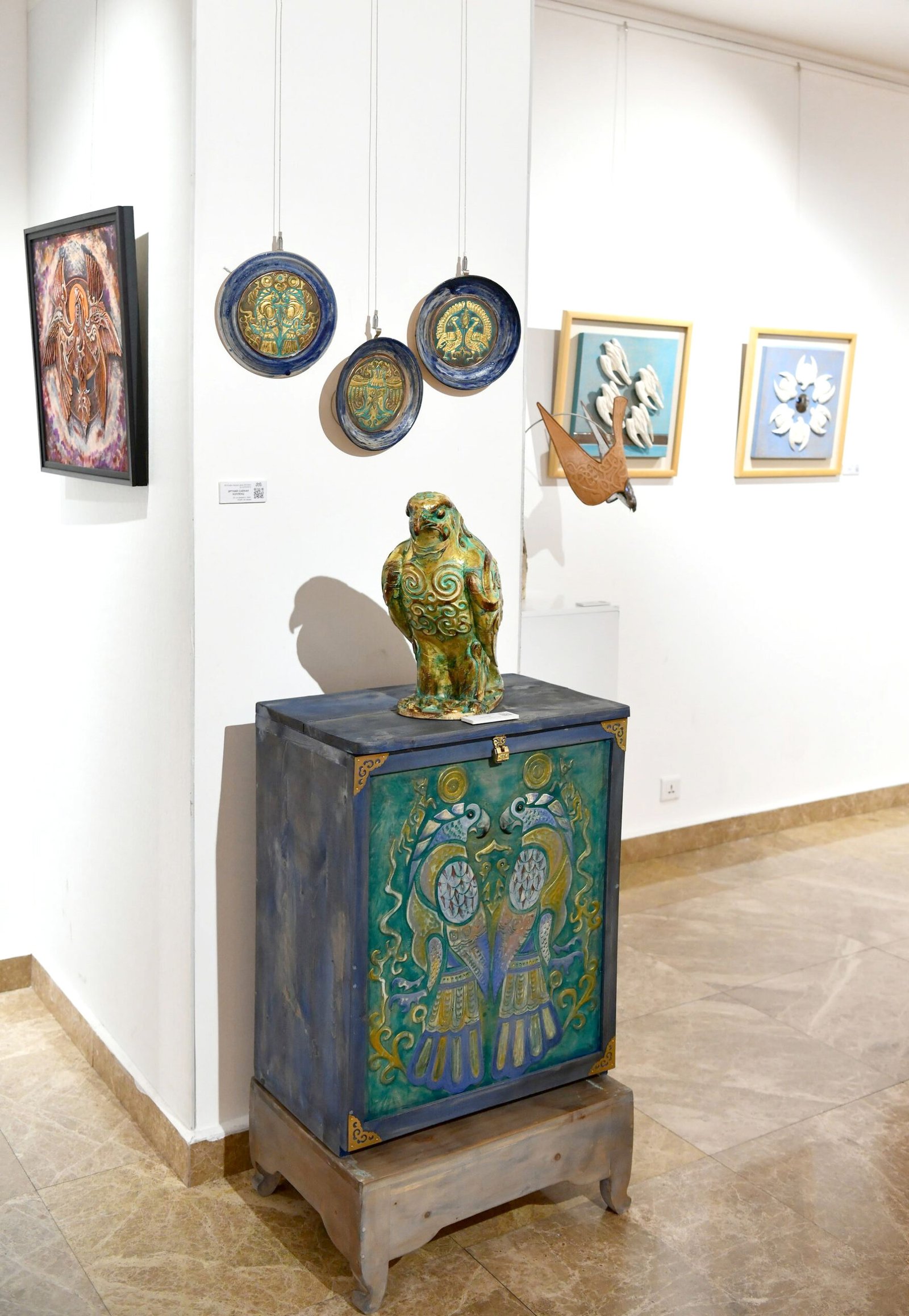 As an artist, I depicted the national pride birds—the falcon and the trotting partridge—from 13th-century silk patterns in my works. I carved these images into leather, embedded them into a ceramic (clay) plate, and framed them with copper lighting. I then transformed this imagery into a leather embossing and crafted a chest, presenting the whole as a single collection piece.”
