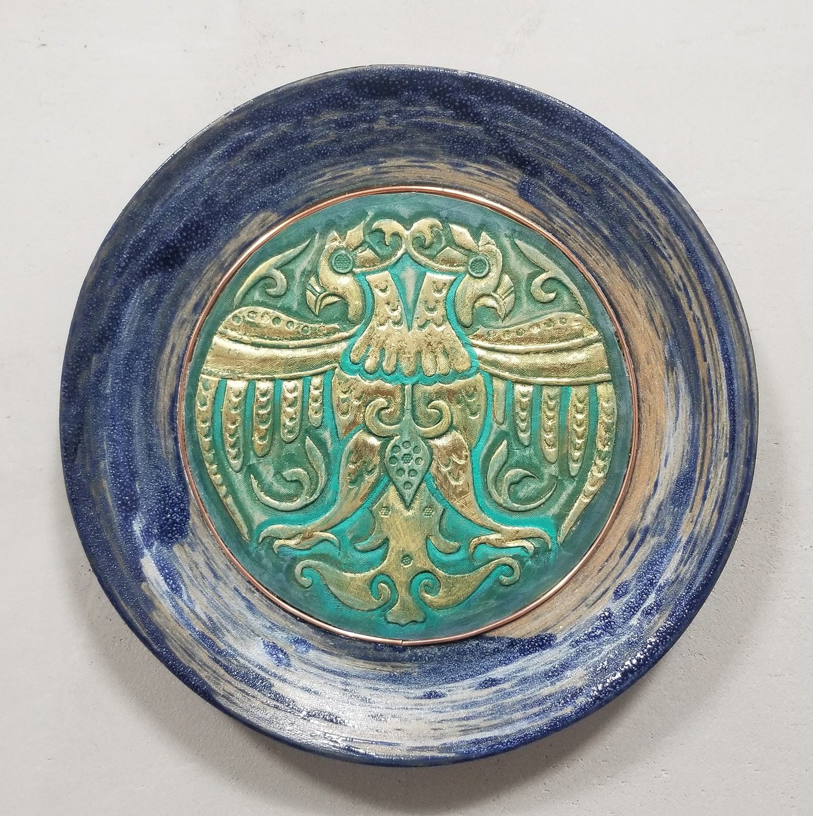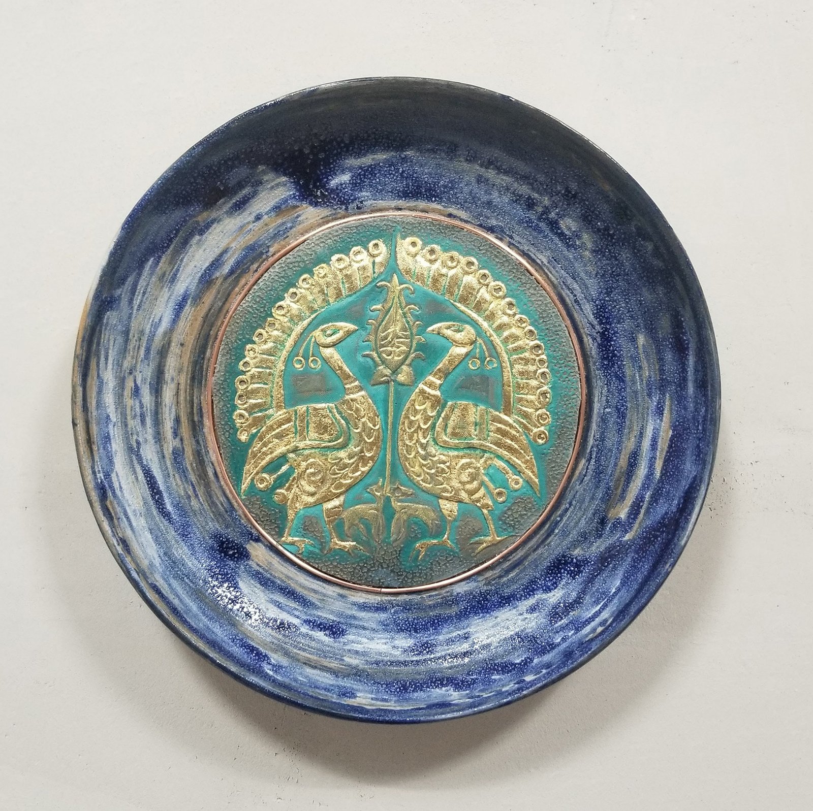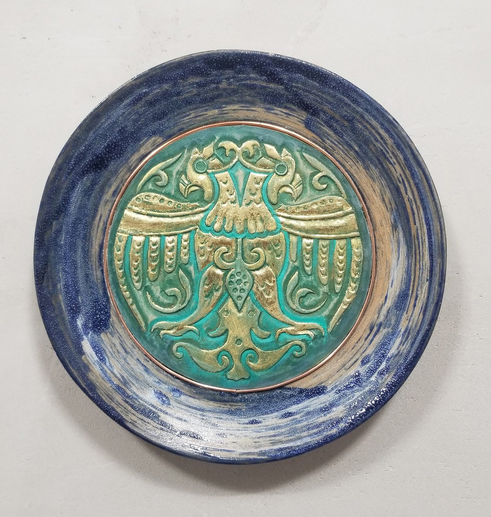 As an artist, I depicted the national pride birds—the falcon and the trotting partridge—from 13th-century silk patterns in my works. I carved these images into leather, embedded them into a ceramic (clay) plate, and framed them with copper lighting. I then transformed this imagery into a leather embossing and crafted a chest, presenting the whole as a single collection piece.”