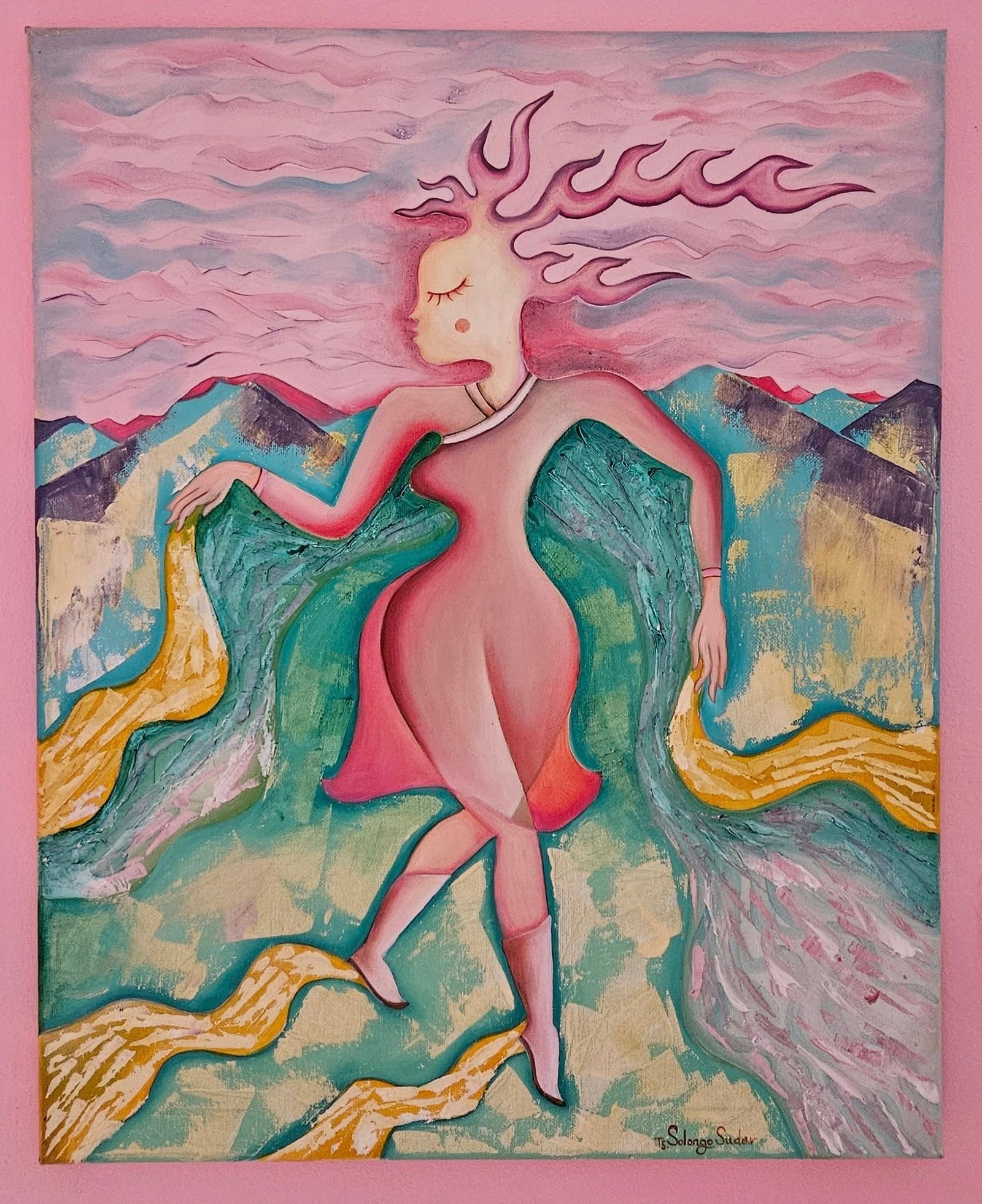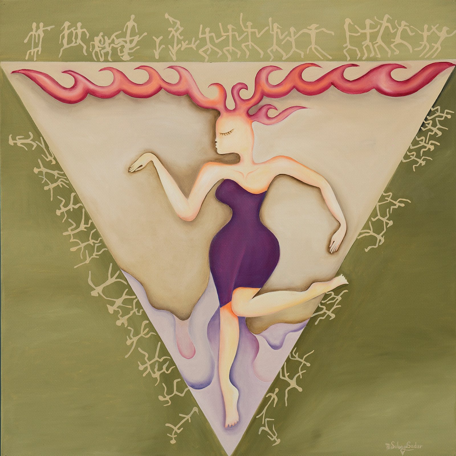 Mongolian traditional dance named Bii Bielgee. It is from nature up energy movement. Artists described triangle around outside 32 people dancing. This dancing people vision from Mongolian, one of the provinces, Dundgobi, “Del” mountain on the rock painting at 2000 BC, the Bronze Age. The artwork’s centre composition is a Mongolian wisdom woman looks like traditional dance Bii Bielgee.