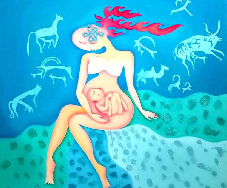 Symbol of Protection Which Mongolian traditional hanging cradle filled with creation through international traditional behaviour of loving the world. This artwork composition is like a Mongolian traditional dream catcher. Every human has inside mother love and mother heaven. The world is Mother.
